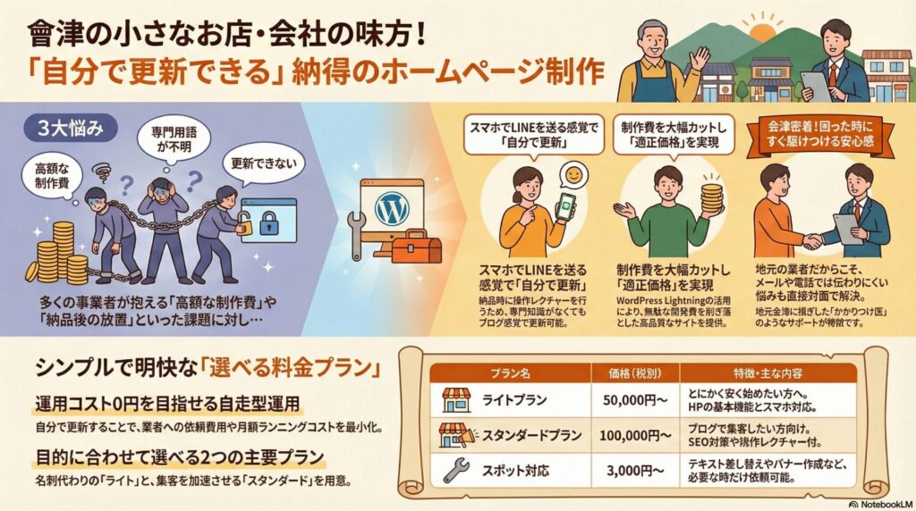 「あいづウェブプランニング」は、会津若松市を中心に、中小企業や個人事業主様のホームページ制作を行っています。「ただ作るだけ」ではなく、自分で更新できる仕組みづくりや、集客のためのブログ活用法までサポートします。